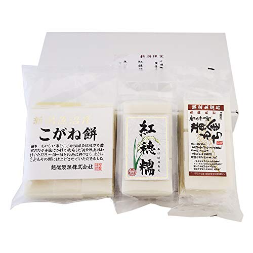 新潟魚沼産のもち米を使用したおもちで、小金持ち、黄金もち、 紅穂糯の食べ比べができ楽しみの幅も広がります