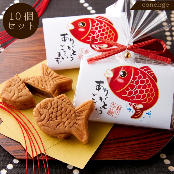 「幸せあげ鯛」の10個セットです。かわいいデザインですし、おめでたい饅頭なので、お祝いの贈り物にぴったりだと思います。