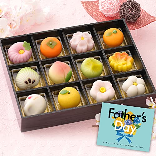 こちらの鮮やかなもみじや可愛い桃や柿などをモチーフにした華やかな上生菓子12種セットはいかがでしょうか。北海道小豆を使用したこし餡が入っており、なめらかな口当たりで上品な甘みで美味しく召し上がれます。お茶会も盛り上がりそうです。