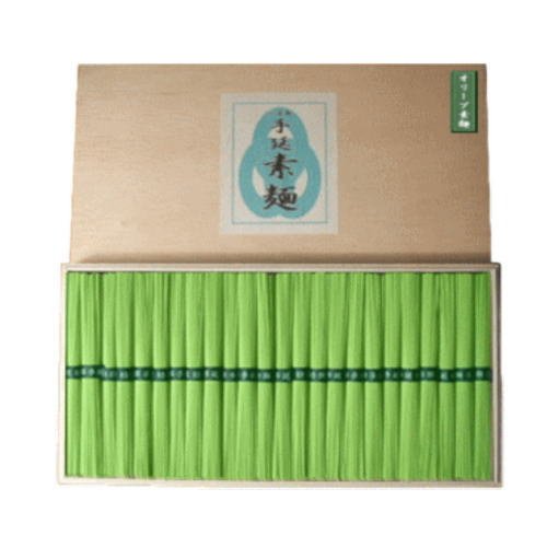 小豆島で栽培されている良質のオリーブ果実を生地に練り込んだそうめんで、色鮮やかで食もすすみます。