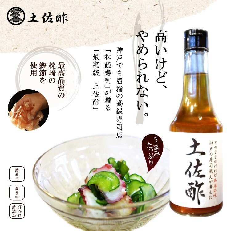 神戸の高級寿司店・松鶴寿司のこだわり土佐酢です。枕崎産の最高級の鰹節を贅沢に使用し、無添加で仕上げた旨味たっぷりのだし酢です。鰹エキスなどは使わず、枕崎産鰹節100%で作っているので、旨味が違いますよ。