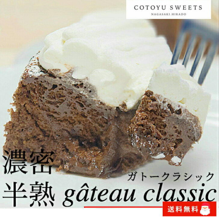 心優-cotoyu sweets-の濃密半熟ガトークラシックです。ダークとミルク、2種類のクーベルチュールチョコレートを使った半熟ガトーショコラで、オランダ産ココアパウダーのほろ苦さと香り高さがチョコの味わいを引き立てています。焼いているのに生チョコレートのようななめらかでとろける食感がたまりません。トッピングの甘さ控えめの純生クリームがよく合います。カット済みなのも食べやすくて◎。