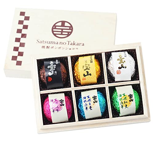 個性が異なる6種類の焼酎が味わえるボンボンショコラで、高級感のある木箱入りもいい感じです。