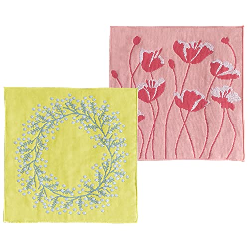 今治のタオルハンカチで綿100%でミモザとボビーのデザインが綺麗だなと思いました。揺らいでいる赤いお花とリースの黄色いお花がお祝いにぴったりで上品なので喜ばれるかなと思いました。