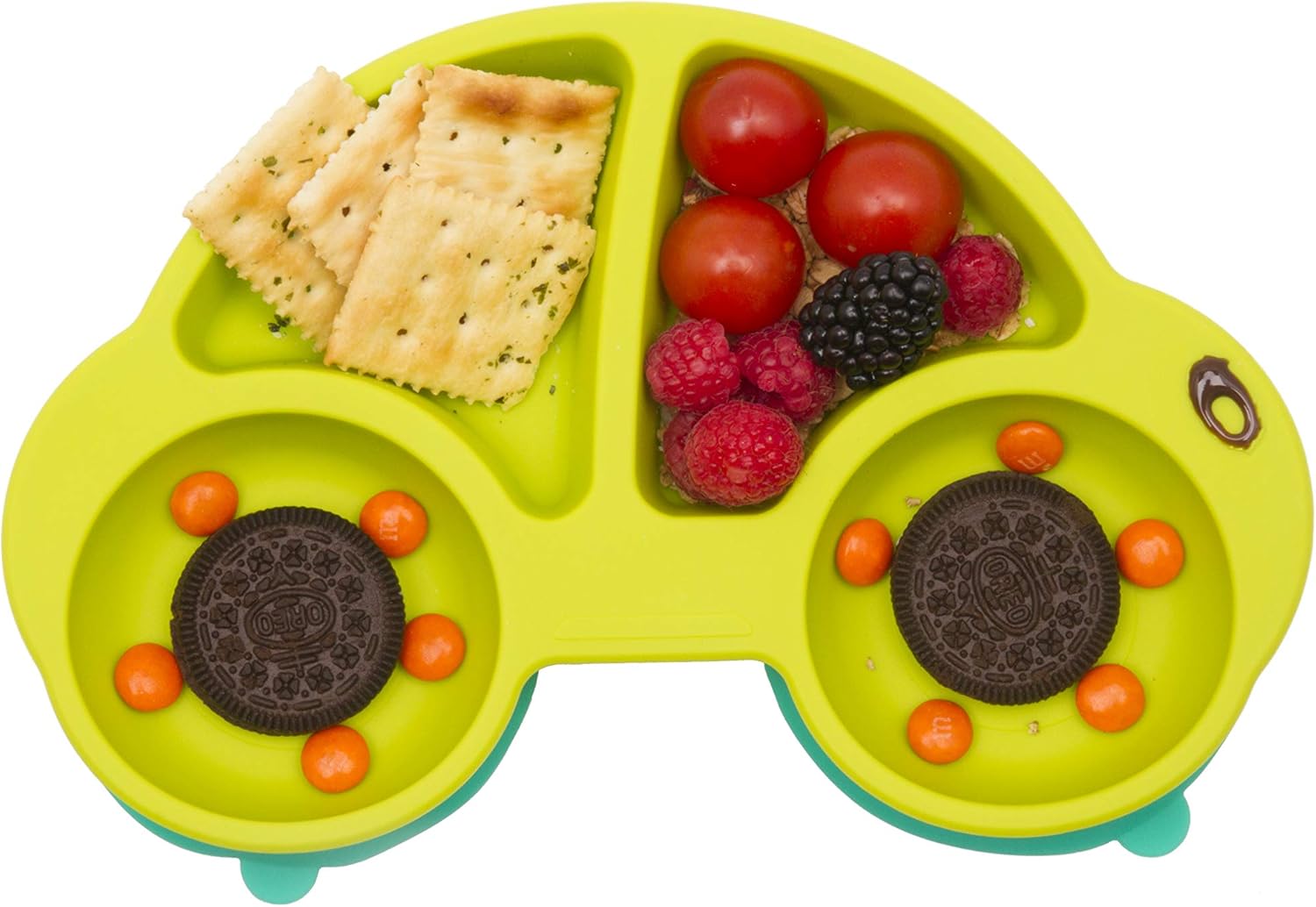 男の子が大好きな車の形のお皿です。底には取り外し可能な吸盤がついていて、使用時はテーブルにくっつけて、収納時ははずしてコンパクトにできます。
