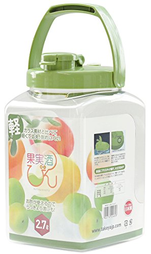 軽くて扱いやすいプラスチック製の果実酒瓶です。本体は汚れにくく、においの付きにくいPETなので、酸に強く、プラスチックでも安心して梅酒が漬けられますよ。ハンドル付きで持ち運びやすく、ワンタッチ開閉の注ぎ口付きなのも便利ですね。2.7Lサイズだと、分量は梅500gに氷砂糖はお好みで250~400gくらい、ホワイトリカー900mlですから、初めてトライするのにちょうどいいと思います。
