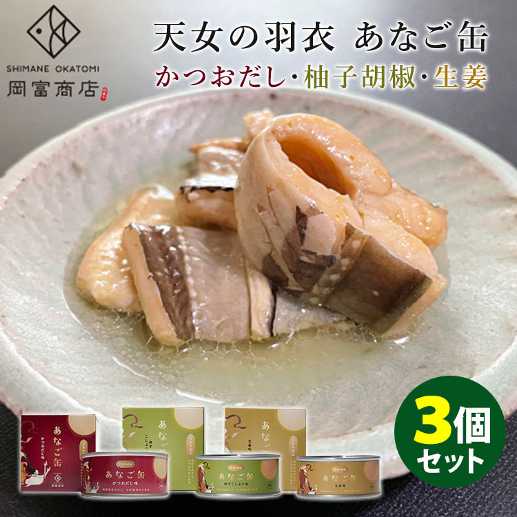 天女の羽衣 あなご缶です。島根県太田市産のあなごを、厳選素材で味付けしたあなごの缶詰3缶セットです。化学調味料・保存料・着色料などを使わない無添加で、新鮮なあなごの旨味を生かしています。かつおだし味・柚子胡椒味・生姜味の3種類で、ごはんのおかずやお酒のつまみにおすすめです。使っているのが超特大サイズの大穴子なので、ふっくら肉厚でおいしいですよ。