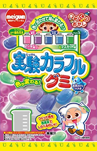 明治チューインガムの実験カラフルグミです。水を加えてかき混ぜると、化学実験のように色が変わるグミ。アルカリ性の素と酸性の素があって、手順に従って決められた量を入れる必要があるので、小さい子だったらパパママがちょっと手伝ってあげるといいかもしれませんね。