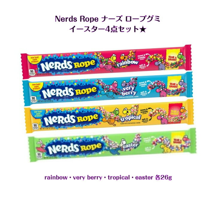 SNSで人気のカラフルなロープグミ4本のセットです。トロピカル、レインボーなど4種類のお味が食べ比べできます。