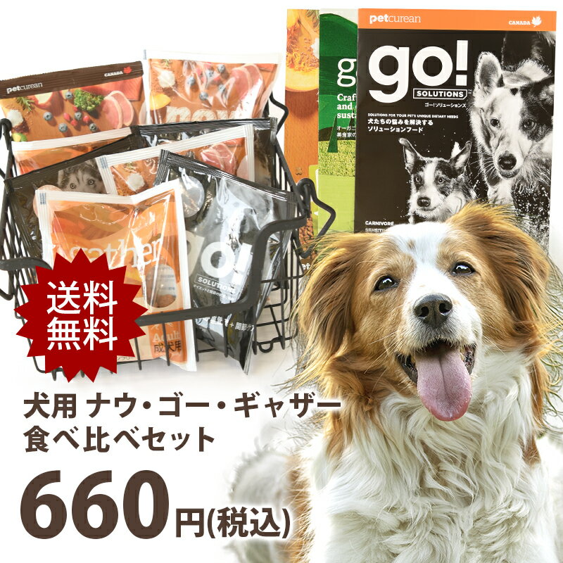 ナウ・ゴー・ギャザーの3ブランドのドッグフード食べ比べセットです。このお値段で6種類のプレミアムフードのサンプルで食べ比べができるのは超お得。リーフレットも入っていて、ドッグフード選びにおすすめです。