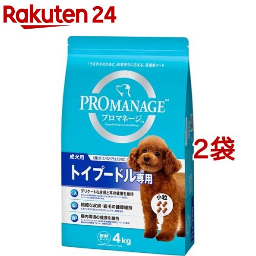 トイプードル用の犬の特徴に合ったドッグフードがありました!プロマネージの成犬用の小粒のドックフードは如何でしょうか。腸内環境の健康を維持し、繊細な毛の健康をサポートしてくれます。お得な4キロ、2袋まとめ買いができ、おすすめです。