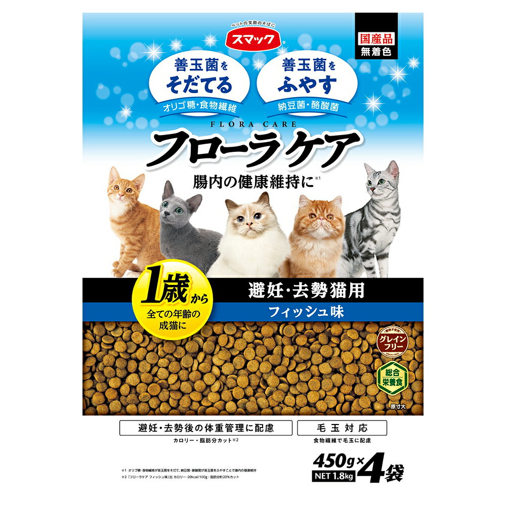 スマックのフローラケアがおすすめです。国産のキャットフードで、グレインフリーです。避妊去勢猫用に栄養バランスが考えられています。免疫力を維持し、腸内フローラを整えてくれます。フィッシュ味で猫の食いつきがよいですよ。