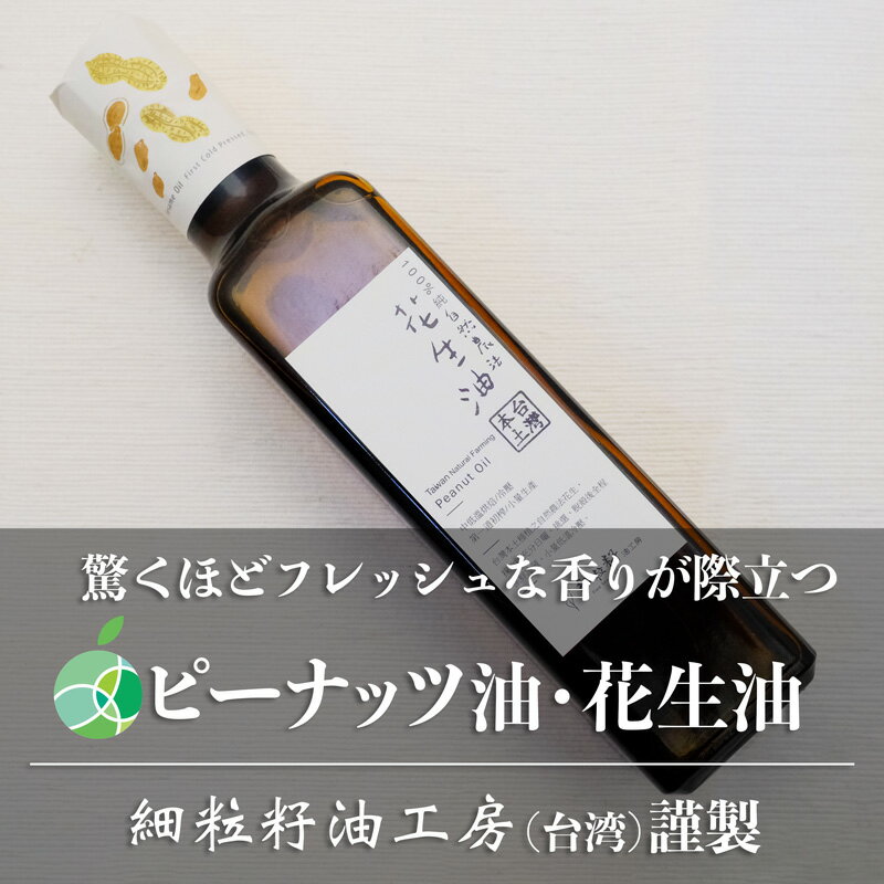 台湾の工房で作られているピーナッツオイルです。コールドプレスの一番搾りで、フレッシュな風味が活きており、品質が高いです。ナムルのように茹でた野菜と和えると驚くほど美味しいです。
