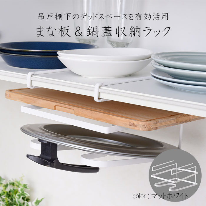 吊戸棚下に差し込むだけで簡単に取り付けられる、まな板&鍋フタ収納ラックです。使う頻度の高いまな板・鍋フタですが、シンク脇に置くと以外に邪魔だし倒れたりしがち。引き出しにしまうと、使いたい時にすぐ取り出せないのが面倒ですよね。吊下げラックに収納すれば、サッと引き出せ、鍋フタも調理中邪魔な時にちょい置きできるから、すごく便利ですよ。
