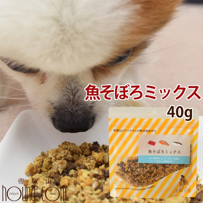 お魚ふりかけというとネコのイメージですが、ワンちゃんも食いつきいいですよ。こちらの魚そぼろミックスは、国産の獲れたて新鮮なまぐろ・鮭・さわらやタラなどの白身魚を使用した無添加ふりかけ。いい香りに引き付けられ、食欲もアップします。そぼろ状なのでおやつにも、フードにそのままトッピングしても手で砕いてふりかけにしても使えます。シニア犬にはぬるま湯で戻してあげるとフードと混ざりやすく、食べやすいですよ。