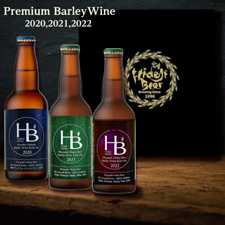 バーレイワインを飲み比べ!宮崎ひでじビールの飲み比べセットです。クリアで重すぎず、バーレイ初心者におすすめの2020、世界で主流のフルーティなアメリカンスタイルの2021、上品でフローラルな王道のブリティッシュスタイルの2022の3本が楽しめます。寒冷地でブドウ栽培ができなかった英国がワインに対抗して作ったのが発祥とされていますから、2022は特におすすめ。ワイングラスで香りを楽しんでみて。