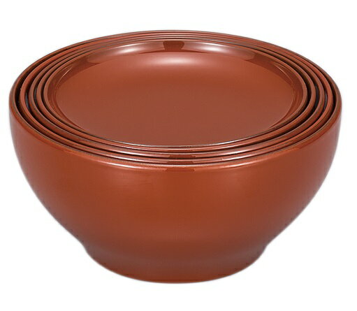山中漆器の5ッ組応量器です。木粉と樹脂を成型した木質素材で、落ち着いた色調の洗朱の漆塗り仕上げです。使わない時はコンパクトに重ねて収納できるのがいいですね。