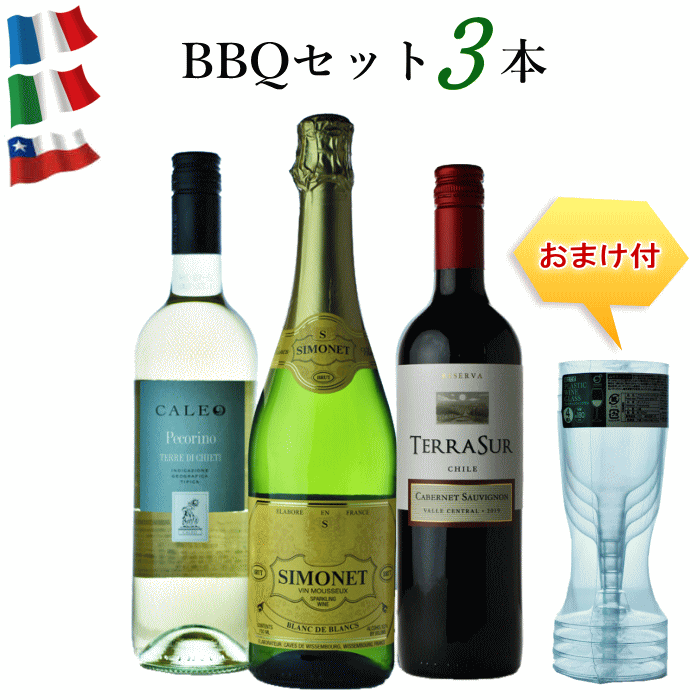 バーベキュー ワイン 3本セットはいかがでしょうか。赤白と加えてシャンパンもセットに入っていて最初の一杯にお勧めです