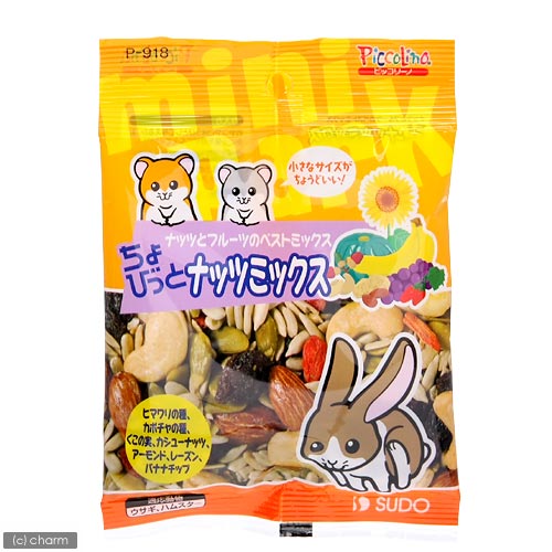 こちらのナッツミックスはいかが。うさぎやハムスターの食事にもピッタリで、食べやすいサイズがいいです。いろいろな素材がバランスよく入っており、栄養価も高く、噛みごたえがあるのもいいですね。