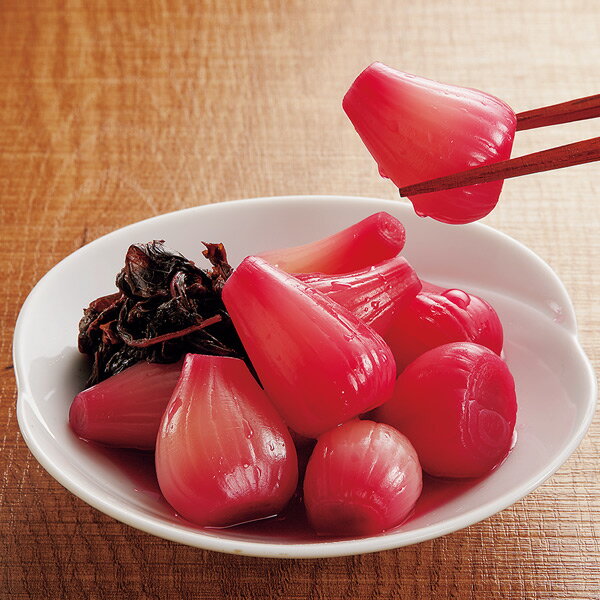 宮崎県産のらっきょうを、国産のもみしそ、梅酢、はちみつなどと一緒に漬け込んだ紫蘇らっきょうです。彩りがきれいで、さっぱりとさわやかな味わい。暑い時期でも食欲がそそられそうですね。