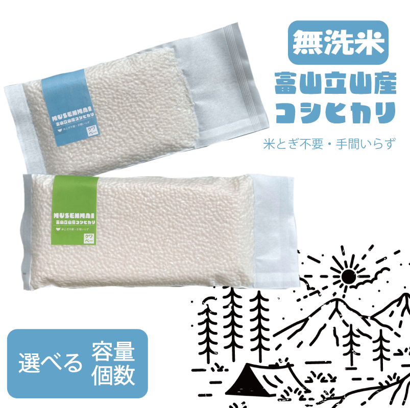 富山県立山町産のコシヒカリです。真空パックのお米は真空状態なら鮮度が保たれて美味しさが長持ちしますが、開封したら普通のお米と同じなので、小分けがおすすめです。こちらのお米は、1合・2合から容量が選べ、10個・30個・50個から入数が選べます。使い切りだと、常に新鮮なお米が食べられますよ。