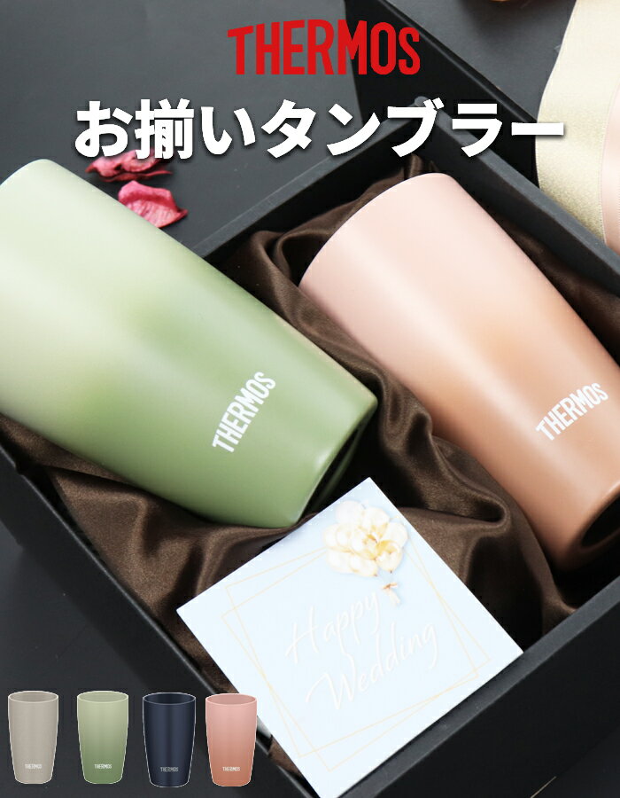 サーモスのペアタンブラーセットです。魔法瓶と同じ真空断熱構造で、保温・保冷効果が高く、結露もしにくい使いやすいタンブラーです。ステンレス製ですが、陶器のような質感で手なじみがよく、口当たりも優しいのがおすすめポイント。内側がセラミック加工で汚れが付きにくいのもいいですね。ピンク+グリーン、グレー+ネイビーの2タイプから選べます。お祝いのギフトカードと、箱にはダブルリボンとパール飾り付きです。