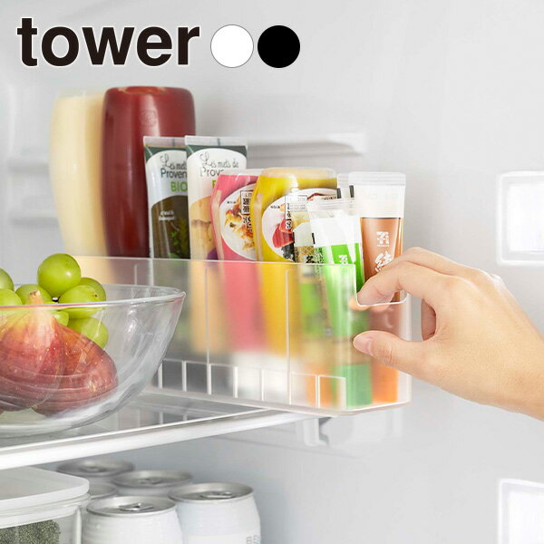 冷蔵庫に収納しやすい程よいサイズに視認性の良いクリア素材を採用したタワーブランドの冷蔵庫ラックがおすすめ。調味料などがコンパクトに収まってサッと引き出しやすい形状を採用しているので、毎日のお料理やお食事にスムーズに対応できますね。