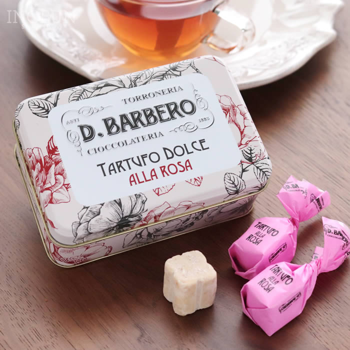 イタリアのお土産にするチョコレートなら、1883年創業の老舗、D.BARBEROのトリュフチョコレートはいかが。こちらのトリュフ、クラシカルなデザインの缶も可愛いので、女子ウケしますよ。キューブ型のトリュフはホワイトチョコベースで、ローズエキスの華やかな香り。ザクザク食感のワッフル、香ばしいアーモンドダイスが入っています。ローズ缶の他、ピスタチオ缶もありますよ。