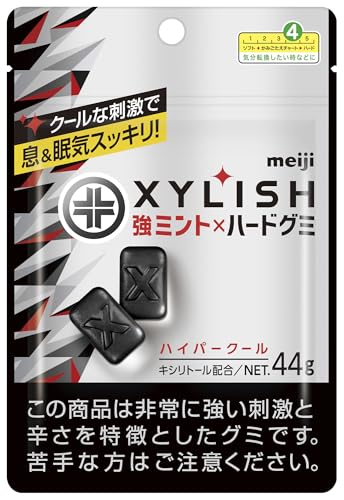 明治のキシリッシュグミ ハイパークールです。むちゃくちゃ刺激的なミント感×ハードな弾力食感で、そんなに食べられない(笑)からダイエットにいいと思います。冷蔵庫で冷やすと、硬さが増すのでおすすめ。ほんとこれ、口の中が一瞬で冷蔵庫になりますよ。
