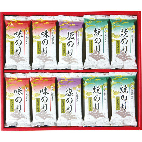佐賀市にあるサン海苔が販売している海苔のセットです。味のり・焼きのり・塩のりの3種20袋です。佐賀県は都道府県別の海苔の生産量第2位です(以前は20年近く1位でした)。