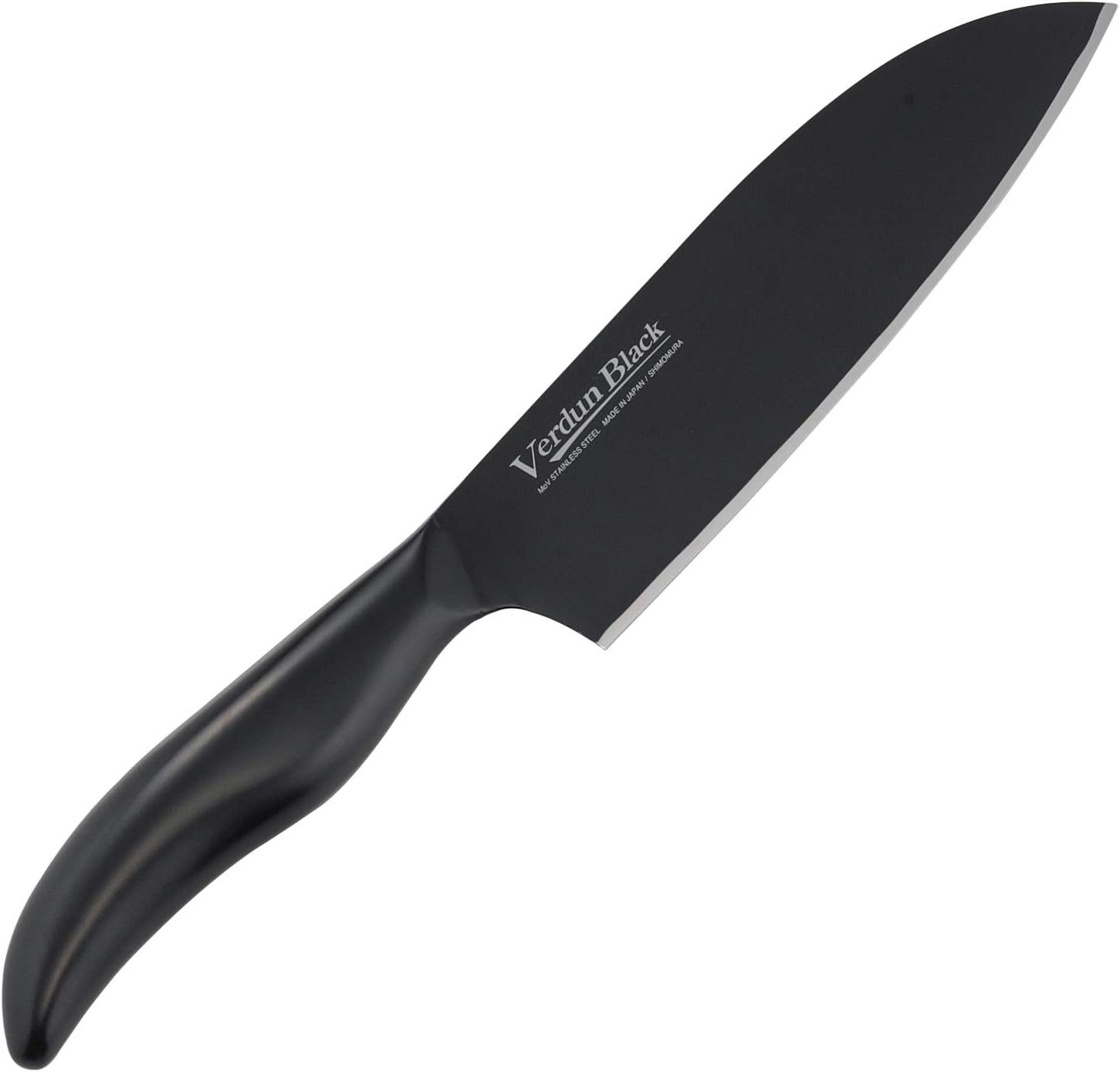 こちらの高級感と重厚感のあるブラックの三徳包丁はいかがでしょうか。見た目もおしゃれですが、刃先はモリブデンとバナジウムが使われていて錆びにくい上に切れ味もよいですよ。