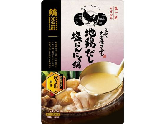 名古屋の有名店・鶏三和の名古屋コーチン地鶏だし 塩にんにく鍋つゆです。名古屋コーチンの鶏ガラをじっくり炊いた地鶏だしをベースに、にんにくをきかせたキレのある塩味の鍋つゆ。にんにく鍋つゆってこってり系が多いですが、塩味のすっきり系なのににんにくのパンチがしっかり効いていて、名古屋コーチンの旨味で鶏肉や野菜がたっぷり食べられるのがおすすめです。〆はラーメン・うどん・雑炊、どれも絶品ですよ。