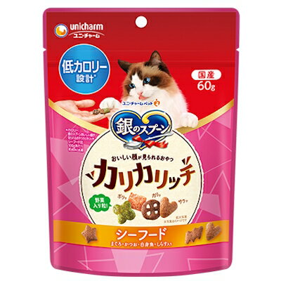 銀のスプーンおいしい顔が見られるおやつ 低カロリー設計 カリカリッチシーフードは、カロリー控えめな低脂肪設計でダイエット中の猫ちゃんも満足できる味なのがいいですね!いろんな触感が楽しめるので飽きずに食べられそうです。