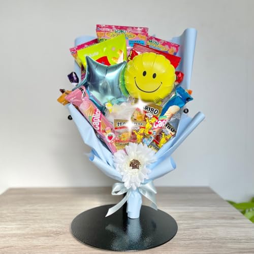 卒園式の日に、先生や子供たちにお菓子ブーケをプレゼントしたいときのおすすめはこちらです。おすすめポイントは見た目がとにかく華やかで写真映えすることです。ニコニコバルーンと星型バルーンとブルー系のラッピングで、贈呈の瞬間に卒園式の特別感が一気に出ると思います。中にはハリボーを始め人気のお菓子がたっぷり入っているので貰った方は絶対に大喜びされると思います。