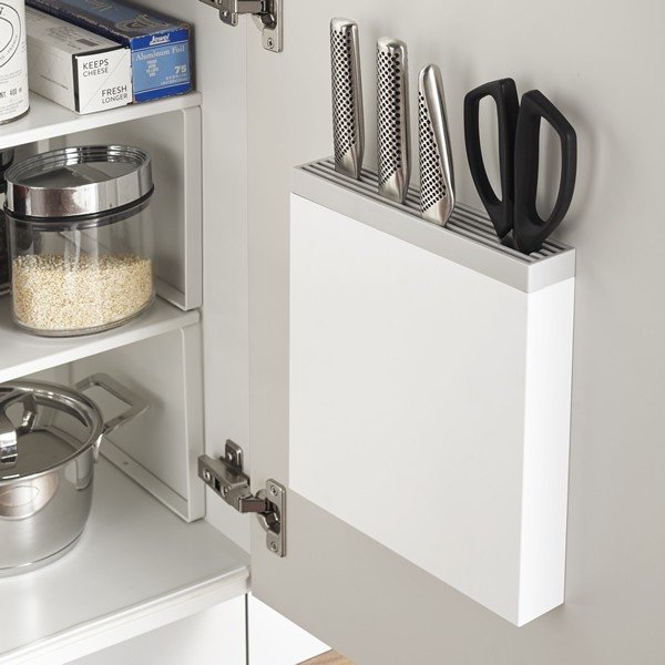 シンク扉の裏まで見逃さない!山崎実業の包丁たてプレートです。キッチンで使う包丁・ナイフスタンドを調理台に置くと結構邪魔。だったら、刃物類はまとめてシンク扉裏のデッドスペースに収納してしまおう、というアイデアグッズです。普段使いの包丁やナイフ、キッチンバサミ、パン切ナイフなどもまとめて収納できるから調理台がすっきり。使いたい時も取り出しやすいです。